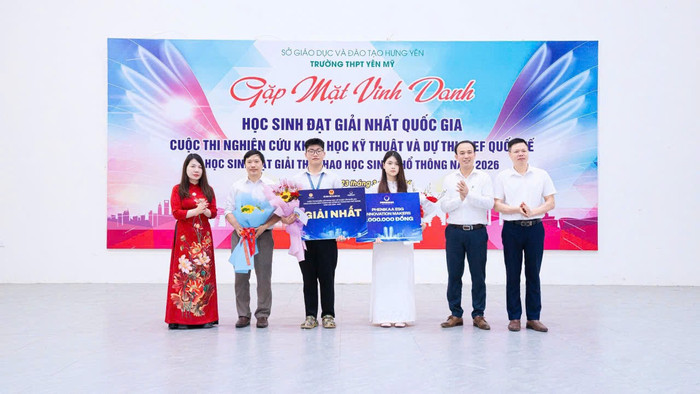 Dự án của hai học sinh Trường Trung học phổ thông Yên Mỹ (tỉnh Hưng Yên) xuất sắc đạt giải Nhất tại Cuộc thi Nghiên cứu khoa học, kỹ thuật cấp quốc gia dành cho học sinh trung học cơ sở, trung học phổ thông năm học 2025–2026. Ảnh: NTCC.